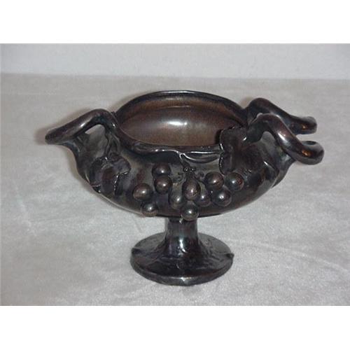 An Art Nouveau Amphora vase, 6" tall, 9" across at handles. The vase is encased in sterling silver the dark color is the result of years of tarnish. On the front of the vase is cluster of grapes in full relief. Sadly one of the four handles is missing, broken off long ago, possibly repairable but just the same the piece is an unusual amphora vase. Marked as shown and sold as is.
