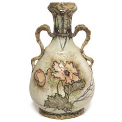 Amphora vase, gourd form with two organic handles and elaborate design of poppies, marked, 8.5”h