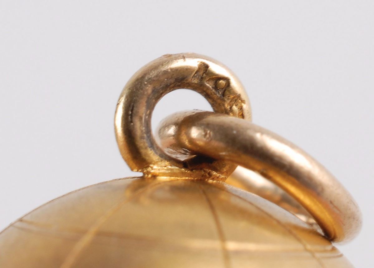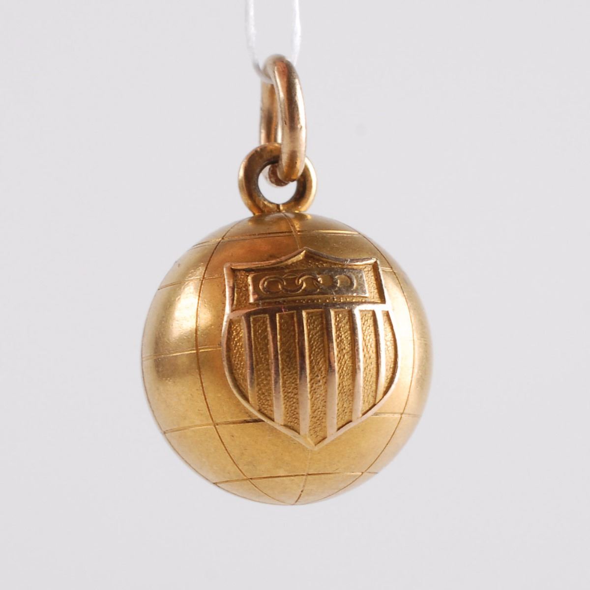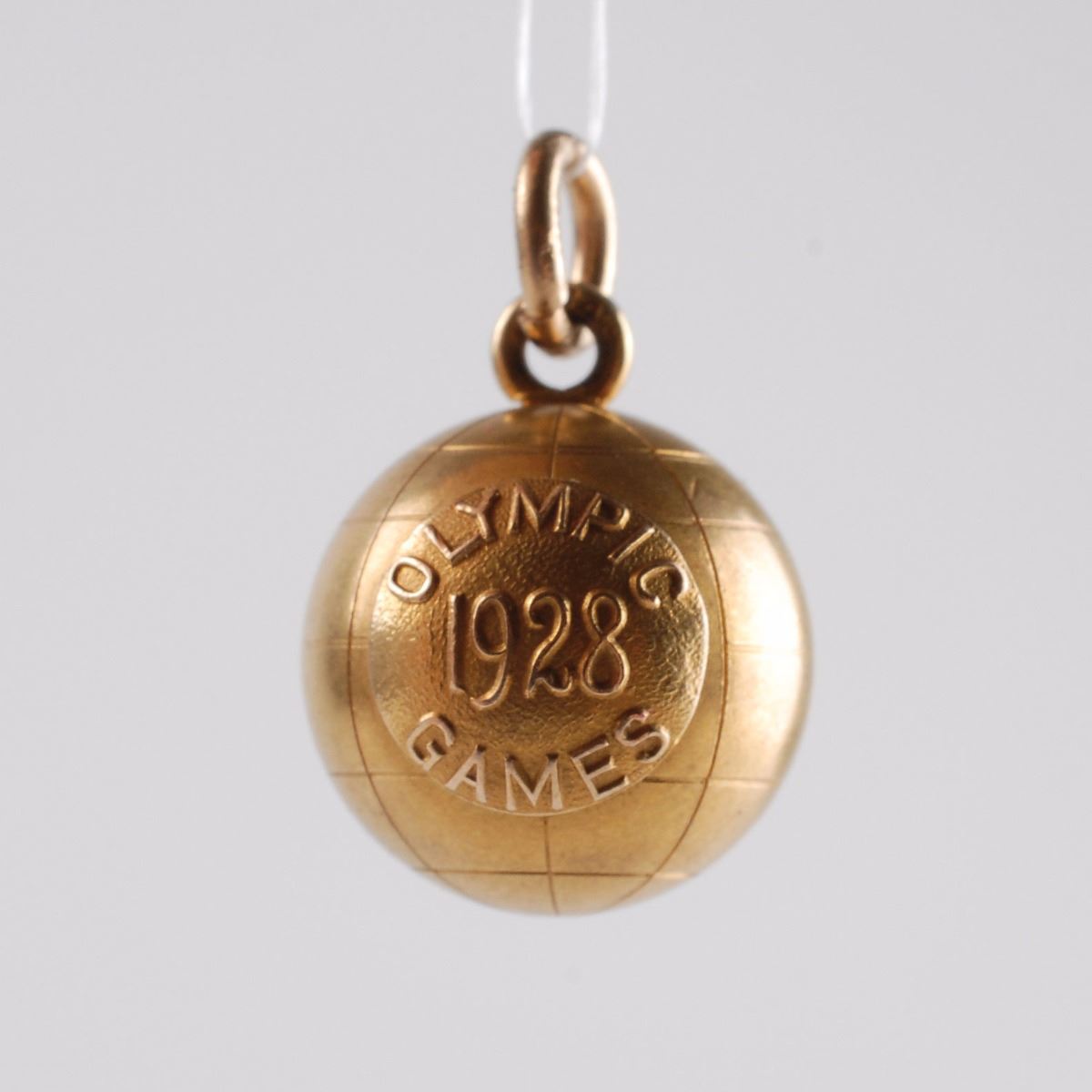 Small 14K gold charm given to female members of the 1928 American Olympic team by General Douglas MacArthur, who served as the president of the American Olympic Committee. The charm, measuring approximately half an inch in diameter and weighing four grams, is in the shape of a globe and bears the US Olympic Team emblem on one side and the text, “Olympic Games, 1928,” on the other.