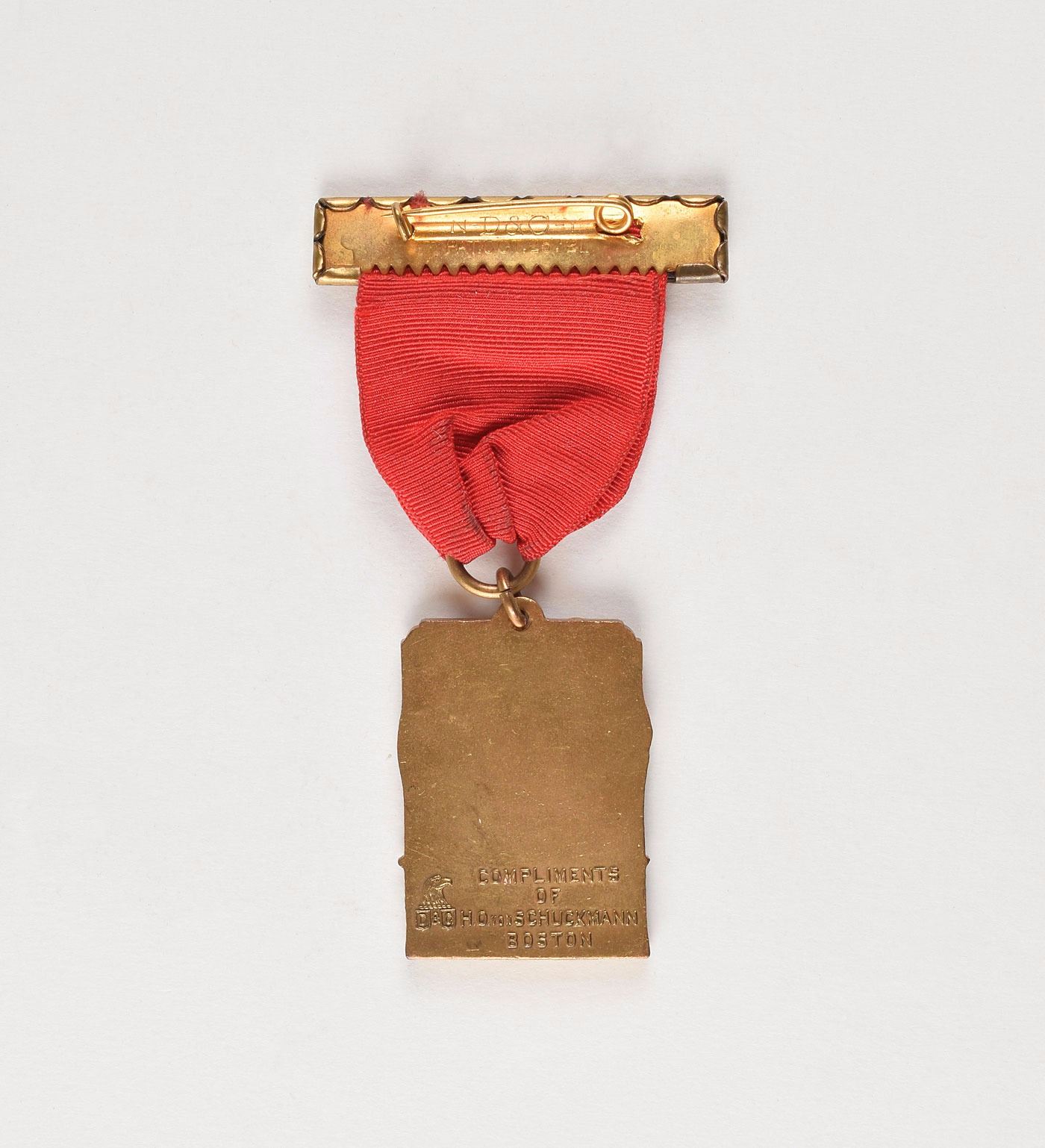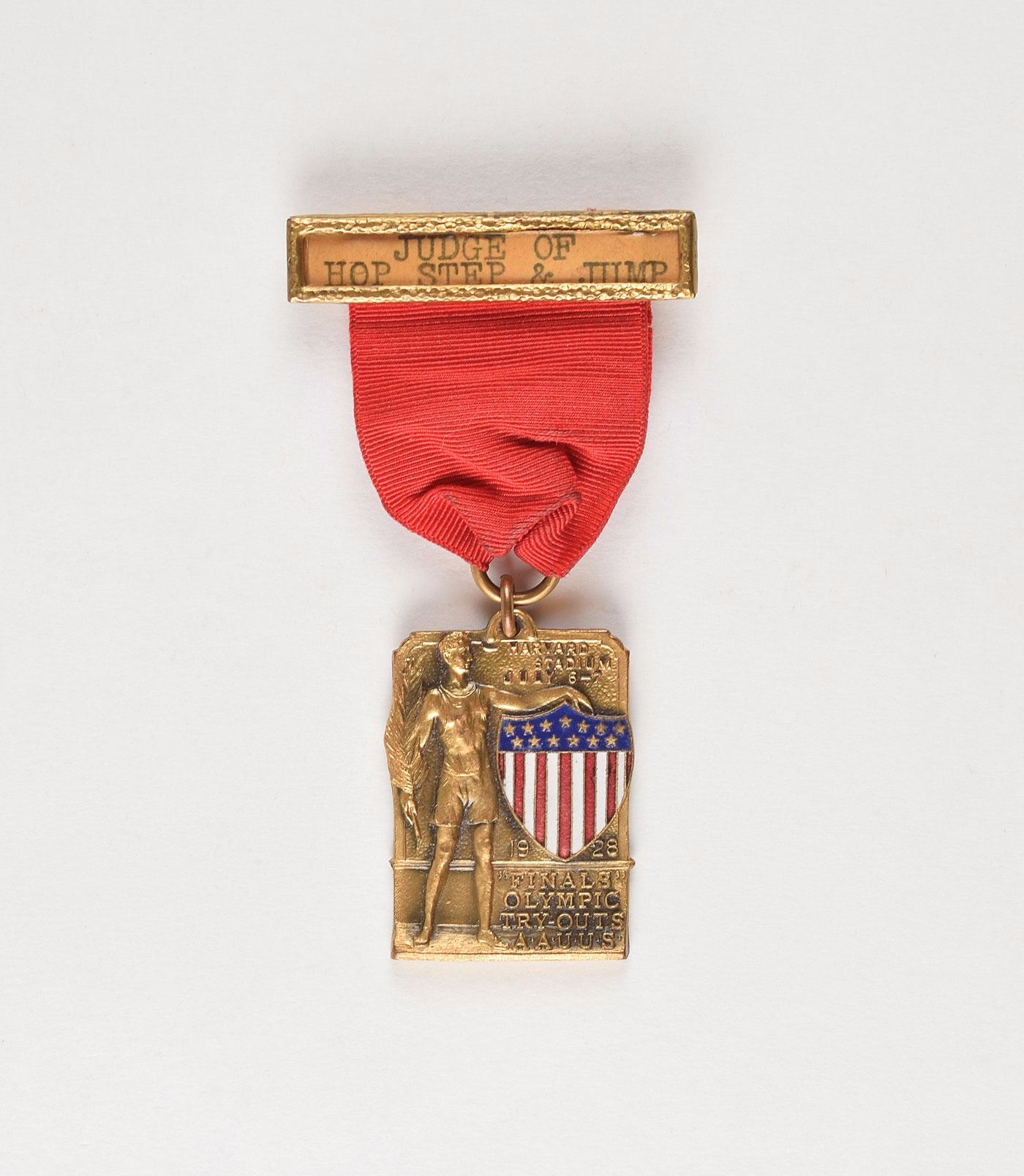 Fantastic judge's badge from the 1928 American Olympic trials held at Harvard Stadium, 45 mm x 85 mm, 22 gm, featuring a bar with typed caption, "Judge of Hop Step & Jump," below which is a medallion suspended from a red ribbon. The medallion depicts an amateur athlete beside an enameled red, white, and blue patriotic shield, and reads, "Harvard Stadium, July 6–7, 1928, 'Finals,' Olympic Try-Outs, AAUUS." Reverse of the badge is marked, "Compliments of H. O. von Schuckmann, Boston."