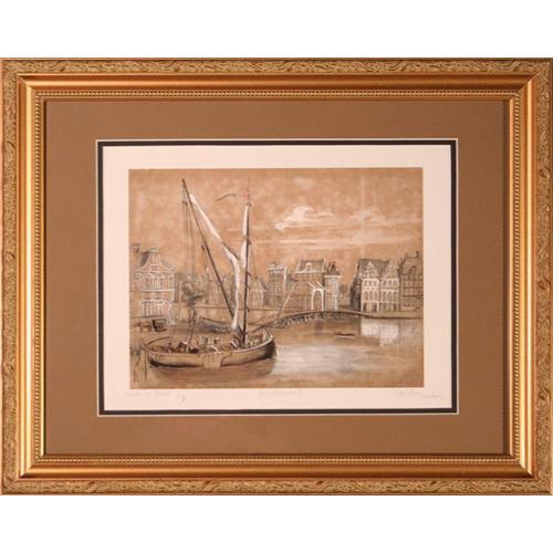 Caroline Lindsay (1820-1880) was a prolific early American artist who painted mainly landscapes of rural America and European places she traveled to. ?Amsterdam I? is a giclee printer?s proof of her original painting/drawing of a beautiful cityscape along the Rhine in the capital city of the Netherlands. A large sailing vessel is seen in the foreground, presumably on its way to port, and the beautiful architecture of the buildings along the water can be seen in the background. The predominantly monochromatic composition is brought to life by Lindsay?s use of bright white highlights to accentuate the facades of the buildings, as well as provide reflections on the water from the sky above. The bright white has also been used to spotlight the canvas sails of the ship, making them a focal point of the piece. The soft suggestion of clouds in the sky was handled with delicate skill so as not to overpower the composition. Fine details were drawn with pencil giving crispness to the architecture without becoming too severe. The deep charcoal bottom mat draws out the dark outlines of pencil while the deep tan top mat compliments the neutral browns that are dominant in the color scheme. The piece is mounted in a beautiful, ornate gold wood frame with intricate beading and carving around the perimeter which adds instant elegance and sophistication to its presentation. Within the print, in Lindsay?s writing, the title ?Amsterdam? is visible as well as the date ?11 Oct./43.? The ...