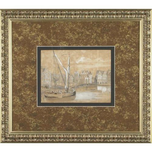 Wonderful drawing in pencil and acrylic. Image of Amsterdam's marina mid 19th century. Original and antique, in great condition. Very beautiful frame with silver ornate details. With a top mat of tuscan brown and gold and a second mat of black to add depth.at the size of 23"x 21"