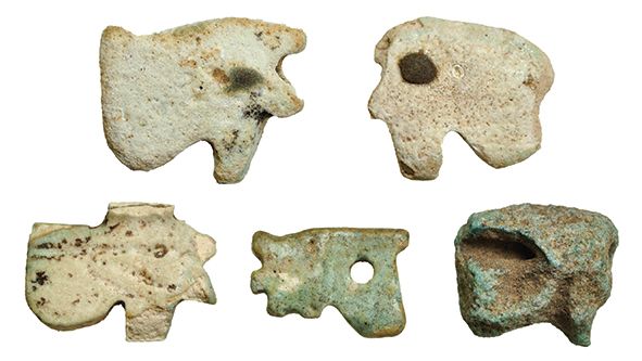 Amuletos de Baja Época (664-525 a.C.). Lote cinco ojos de Horus. Fayenza. Longitud de 0,9 a 1,4 cm.