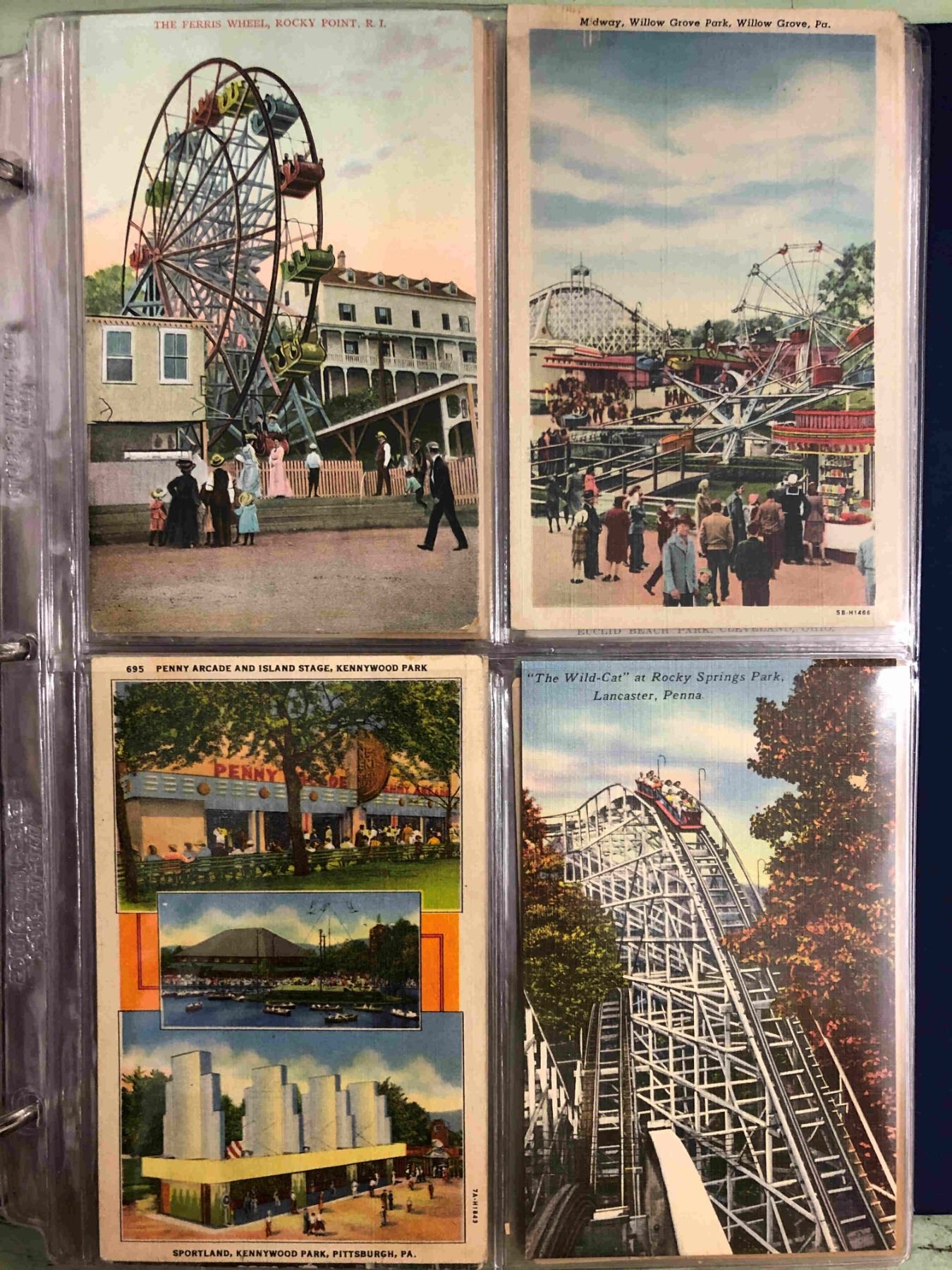 Album of approx. 100 cards of amusement parks. Some states included: PA, OH, NY, & others.