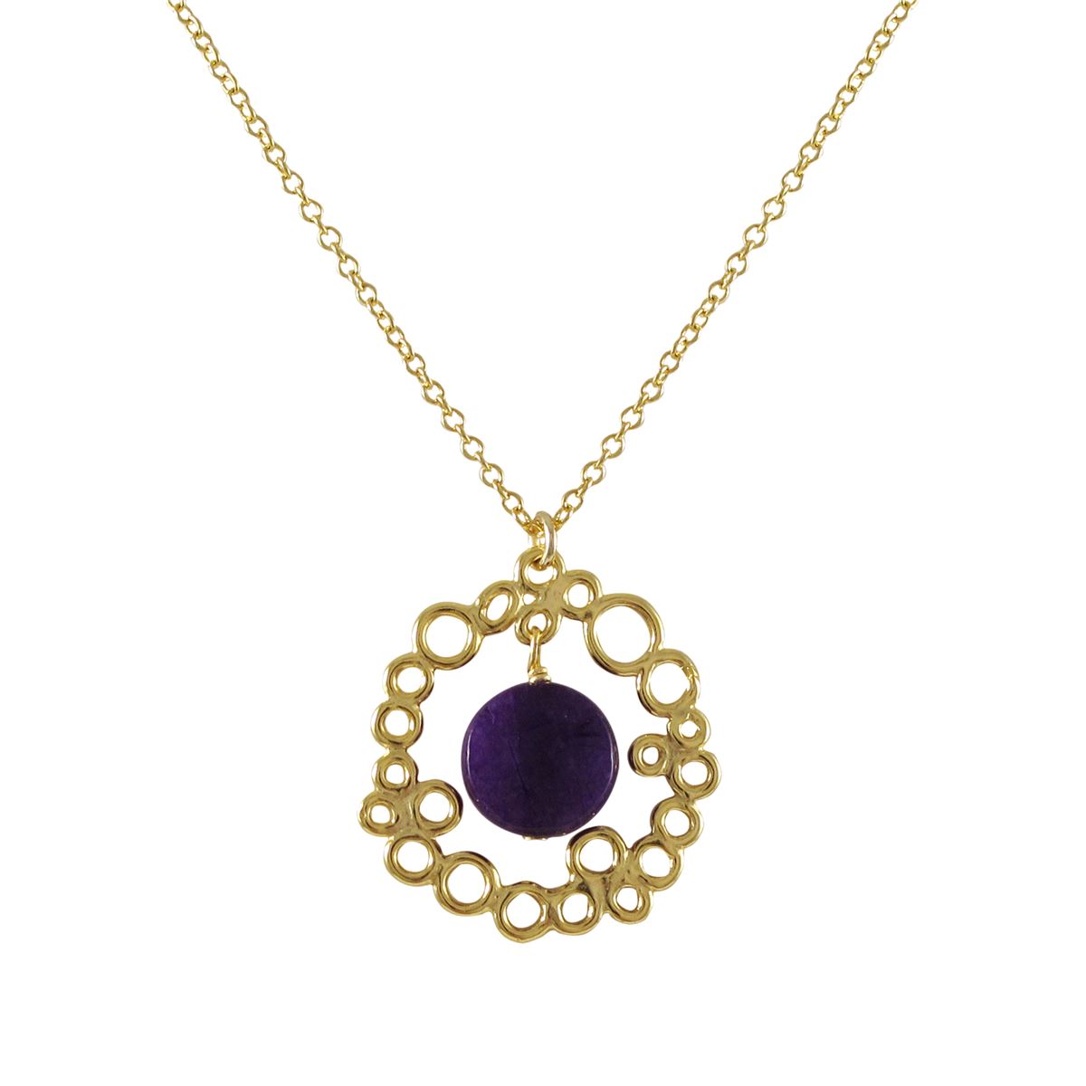 Amy 10Mm Round Semi Precious Stone In Gold Plated Brass Filigree Pendant, 1.08", On Gold Plated Sterling Silver Chain, 18"