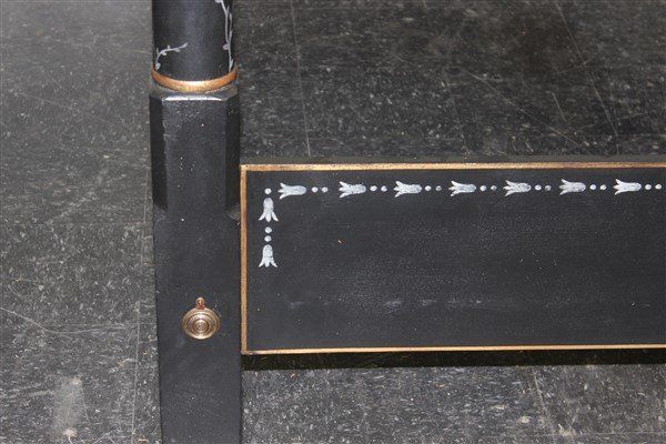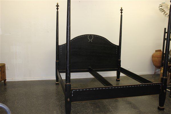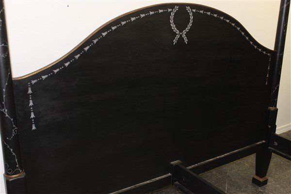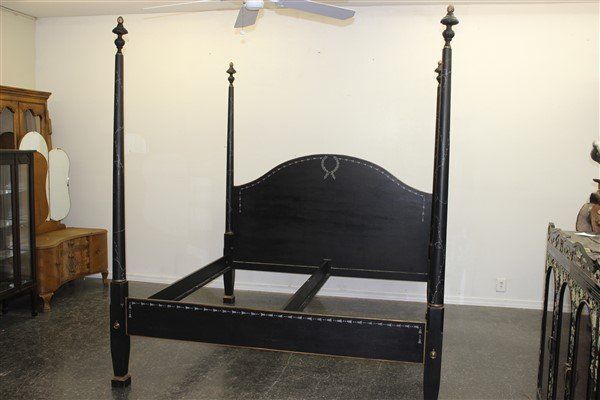 estate item, assembled dimensions 82.0wide x 88.0 deep x 95.0 high, sleep like royalty in this custom king size bed, Features a black finish with gold trim and decorative detailing