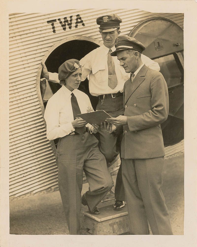 Vintage pearl-finish 8 x 10 photo of Amy Johnson (nee Mollison) with pilot Ralph Charles and manager Carl Flournoy at Central Airport, en route to Los Angeles. Scattered creases, otherwise fine condition. Accompanied by three newspaper articles about her stop dated September 5 and 6, 1933, including one which published this photo. She is quoted as saying, “I am making the cross-country flight to instill confidence in the women of America in flying.”