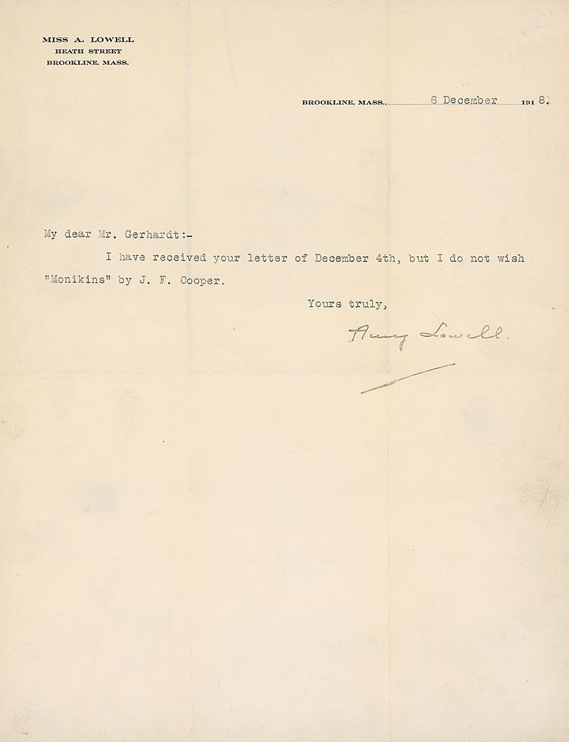 ALS, one page, 8.5 x 11, personal letterhead, December 6, 1918. Letter to a gentleman. In full: “I have received your letter of December 4th, but I do not wish ‘Monikins’ by J. F. Cooper.” Intersecting folds (one vertical fold passing through a single letter of the signature), and scattered creasing, otherwise fine condition.