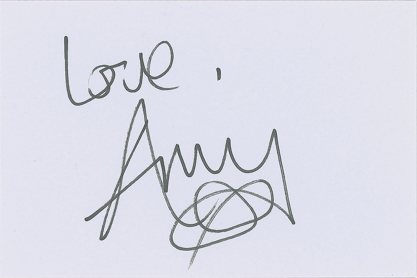 Huge felt tip signature, "Love, Amy,” on a white 6 x 4 card. Reverse bears a pencil collector's notation, "Amy Winehouse, Dingwalls Camden." In very fine condition.