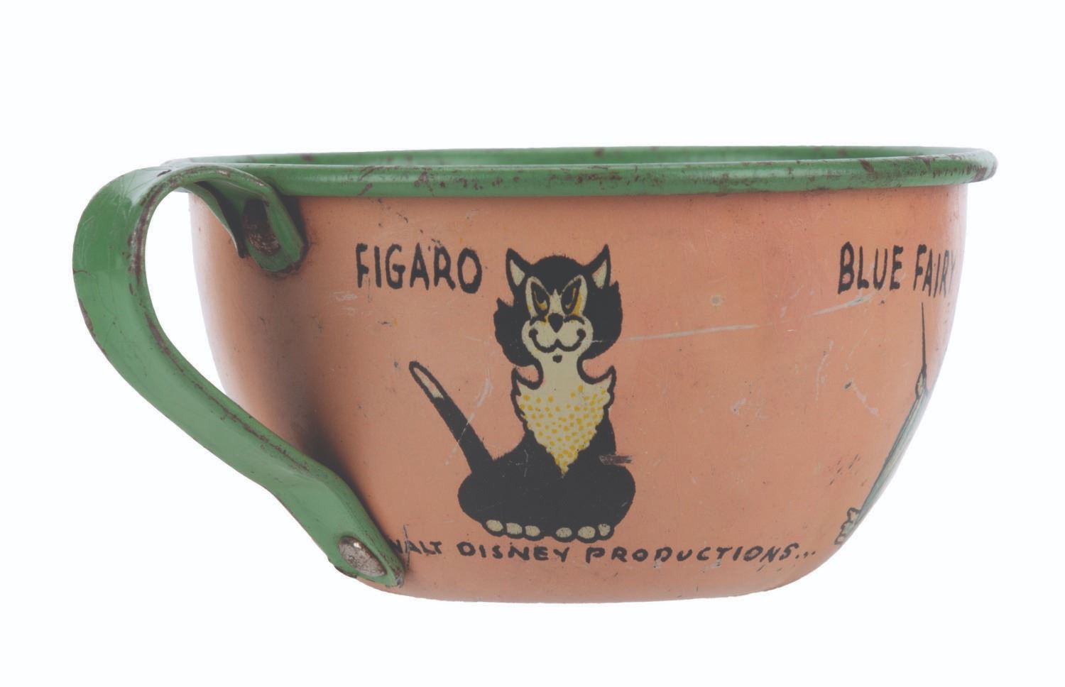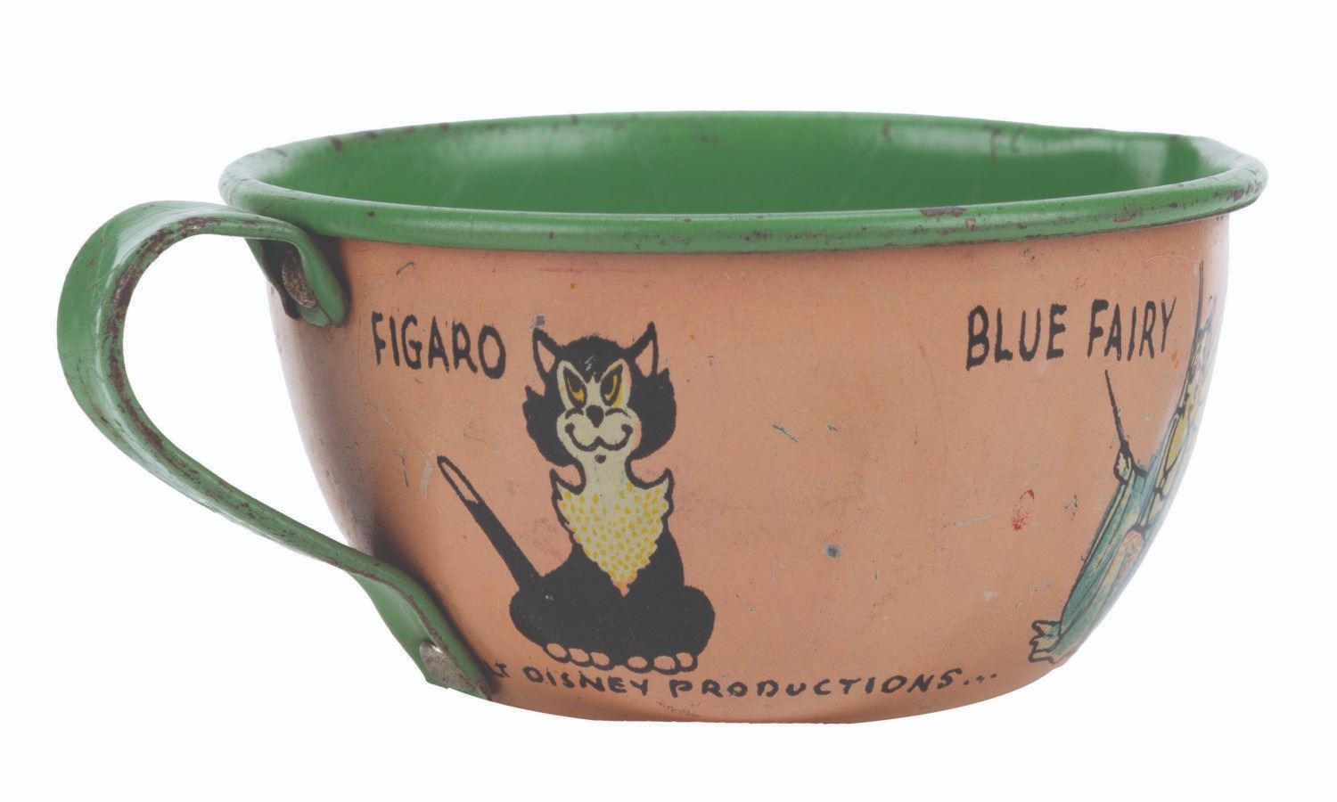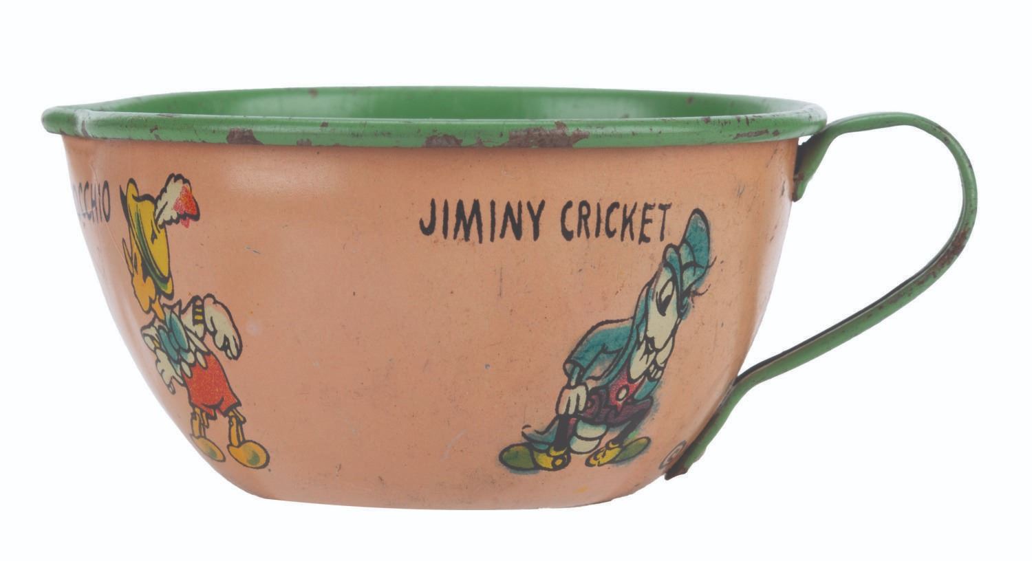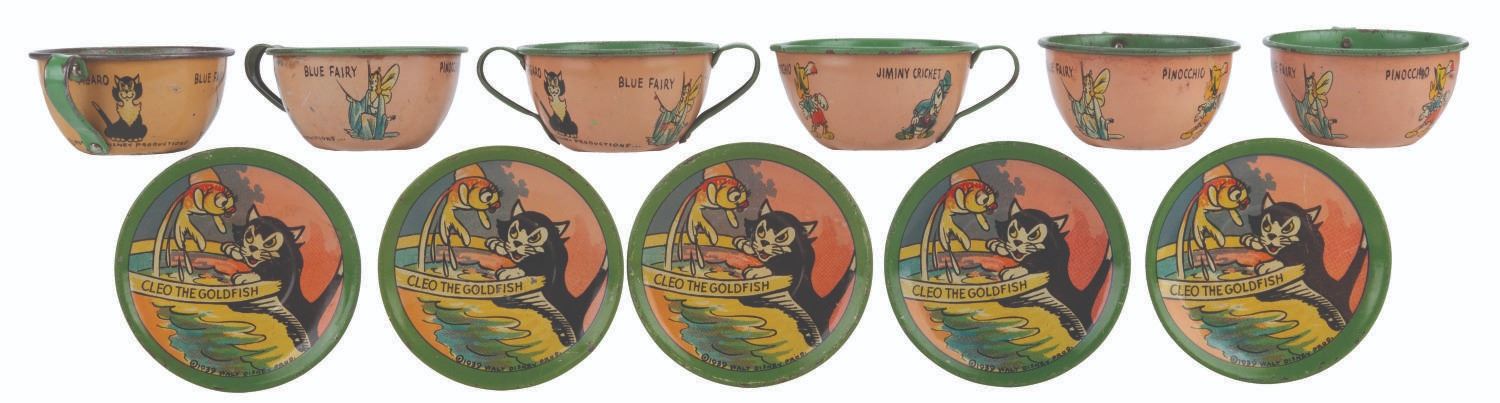 (Ohio Art, 1939) An 11-piece tea set featuring Cleo, Figaro, the Blue Fairy, Jiminy Cricket, and Pinocchio from Walt Disney's "Pinocchio." The tin set includes four cups, five plates, one creamer, and one sugar bowl. Measuring from 2.25" to 2.75" in diameter, the tin dishes are in good to very good condition, with typical wear from play, and areas of paint loss, scuffs, and oxidation most prevalent on the cups.