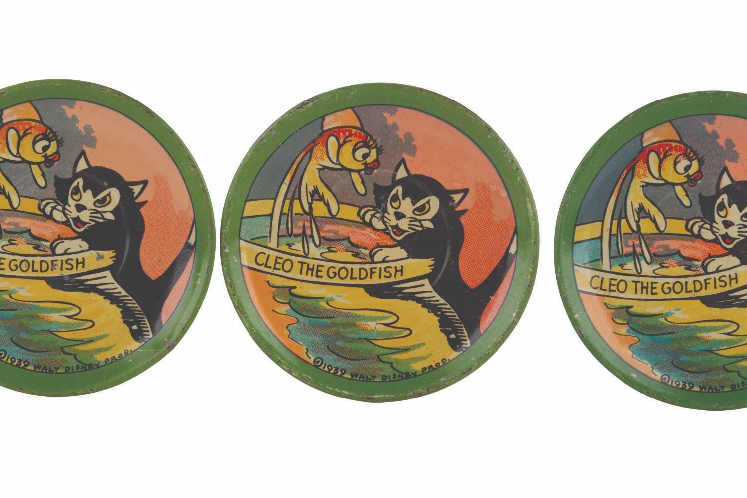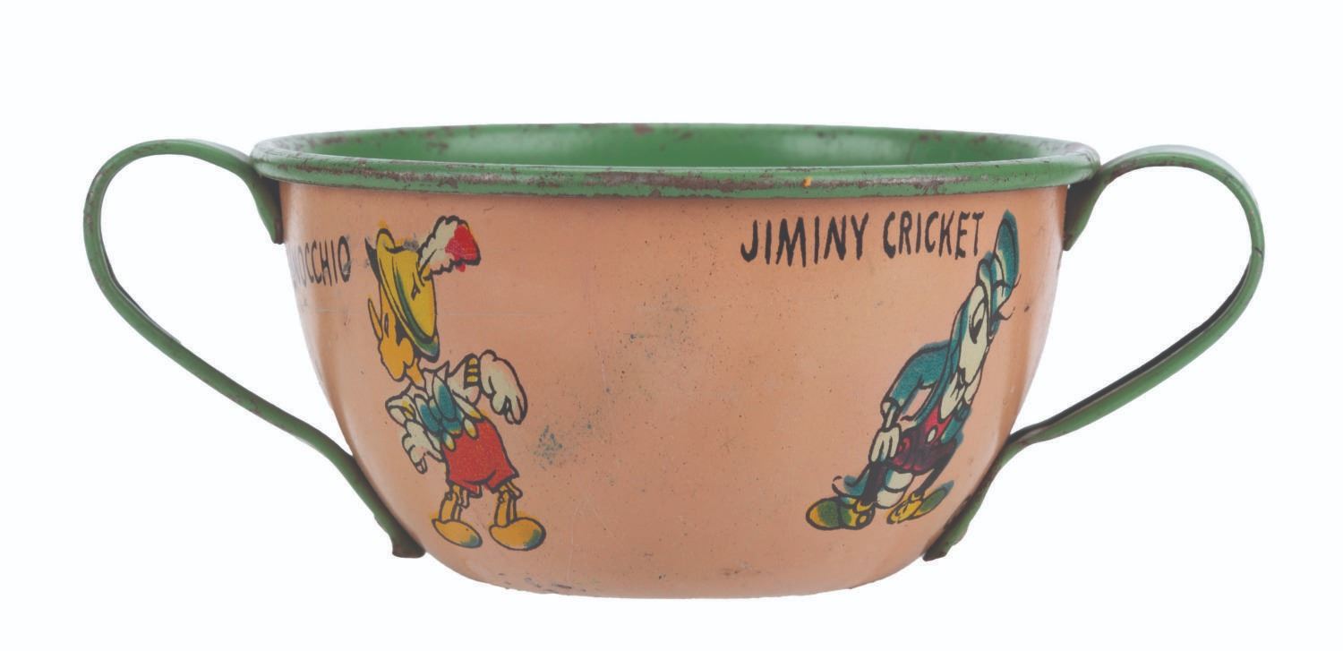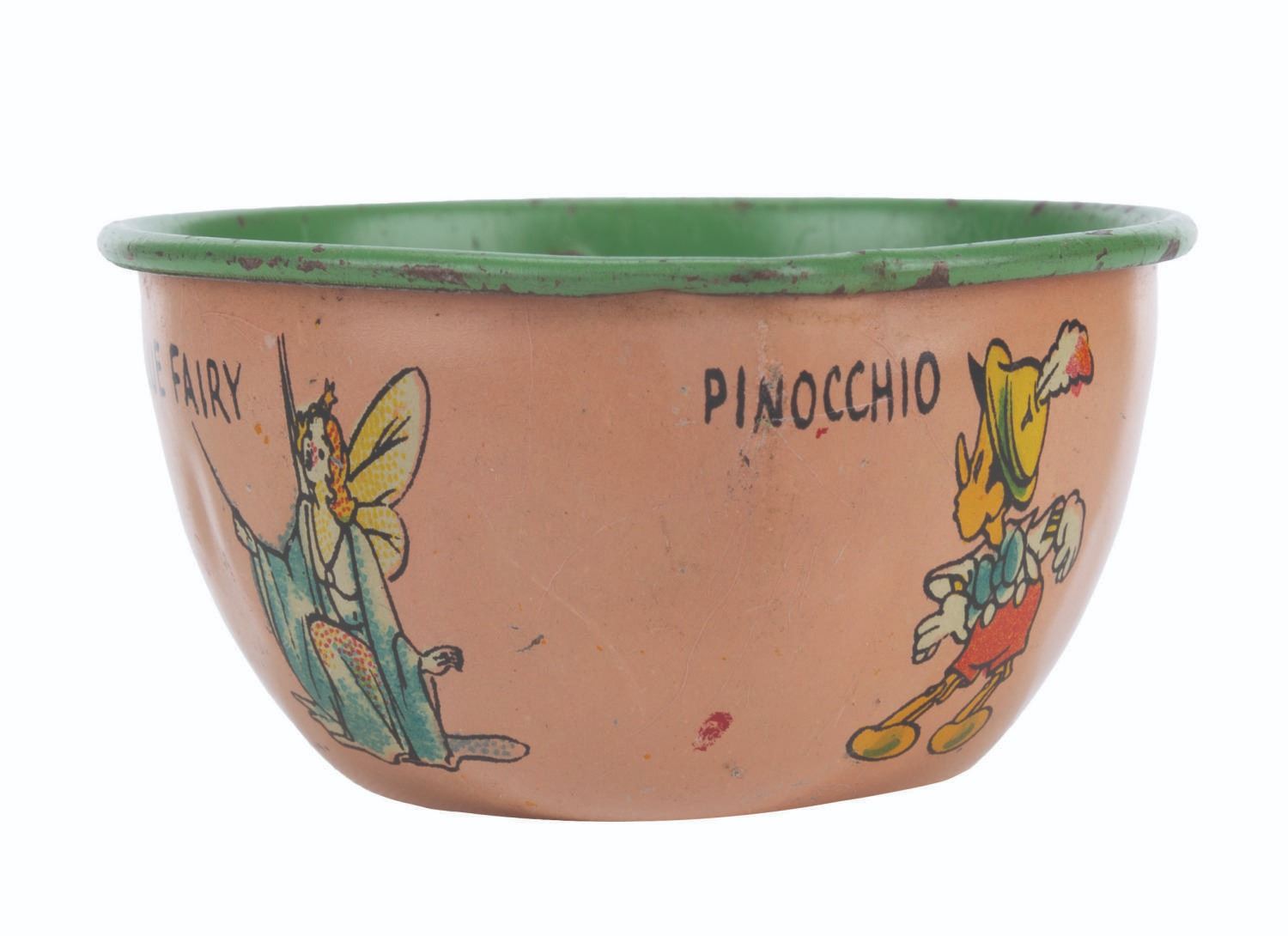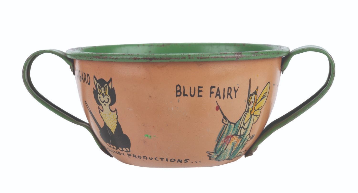 (Ohio Art, 1939) An 11-piece tea set featuring Cleo, Figaro, the Blue Fairy, Jiminy Cricket, and Pinocchio from Walt Disney's "Pinocchio." The tin set includes four cups, five plates, one creamer, and one sugar bowl. Measuring from 2.25" to 2.75" in diameter, the tin dishes are in good to very good condition, with typical wear from play, and areas of paint loss, scuffs, and oxidation most prevalent on the cups.