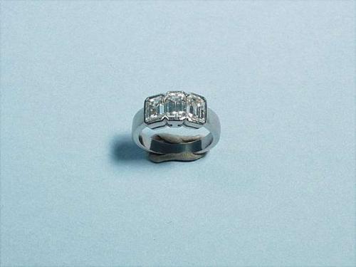 An 18 kt. white gold and diamond "Trinity" ring. Three large emerald cut diamonds of fine quality. Total weight approx. 3.35 cts. With gemologist's certificate. 14000-16000