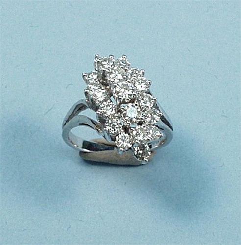 An 18 kt. white gold cocktail ring. Raised mount set with three rows of brilliant cut diamonds. Marked.
