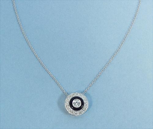 An 18 kt. white gold, onyx and diamond pendant on 18 kt. gold chain. Central brilliant cut diamond surrounded by a black onyx and diamond border. Total diamond weight appx. 0.40 cts. Hallmarked.