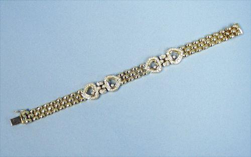 An 18 kt. yellow gold and diamond "happy diamond" bracelet. Four heart shaped links joined by diamond set spacers. Total diamond weight 1.44 cts. Appx. weight 50 grms.