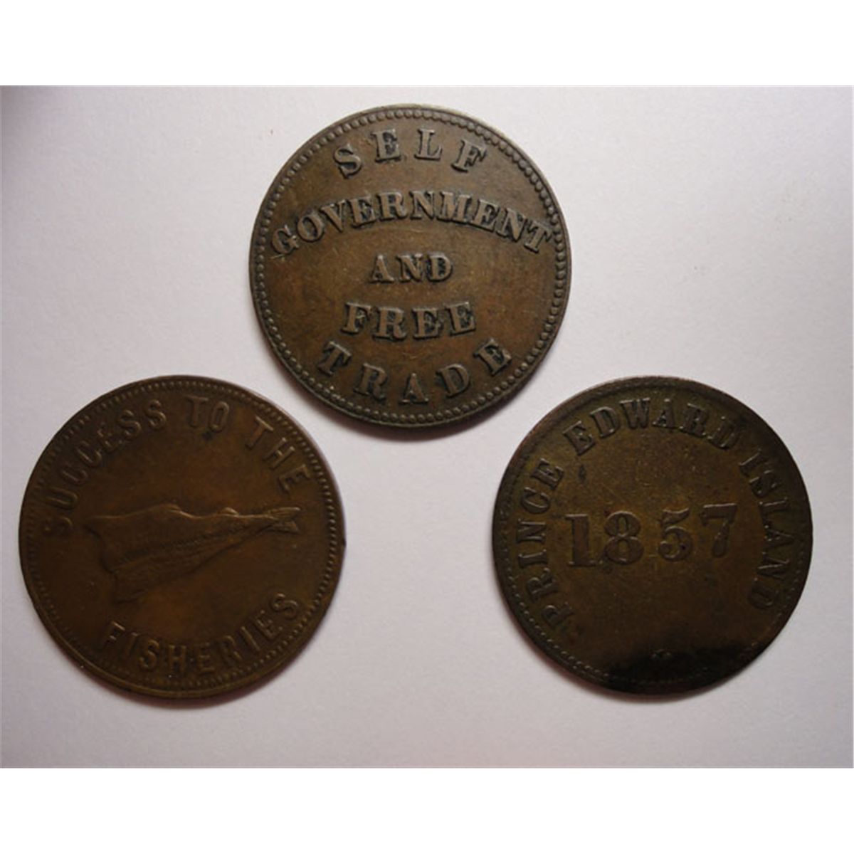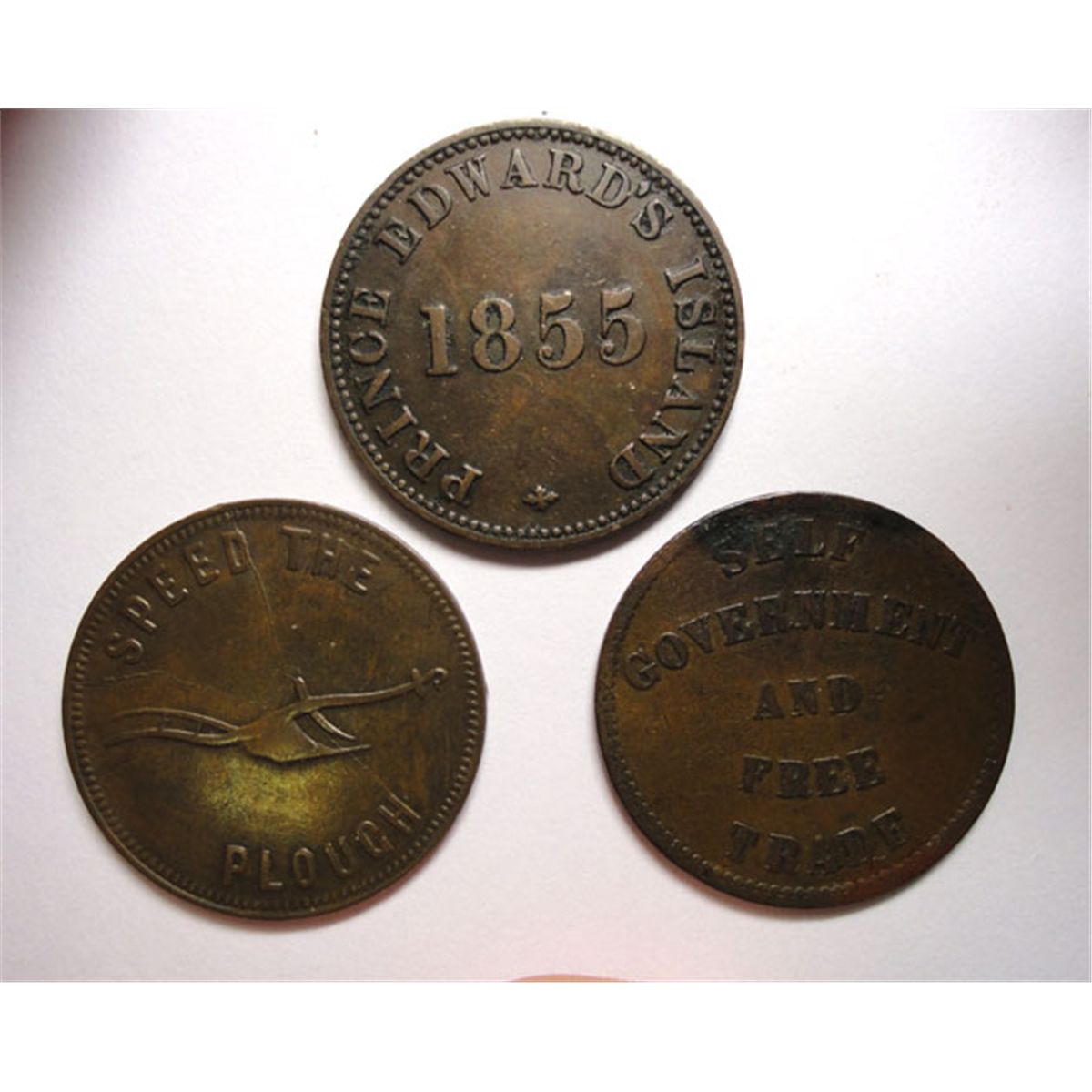 trade tokens were issued by Henry Haszard and George and Simeon Davies to provide small change for merchants and their customers on Prince Edward Island province, Canada. .Also token from Prince Edward Island promoting work on the farm (speed the plow) and in the sea (success to the fisheries).