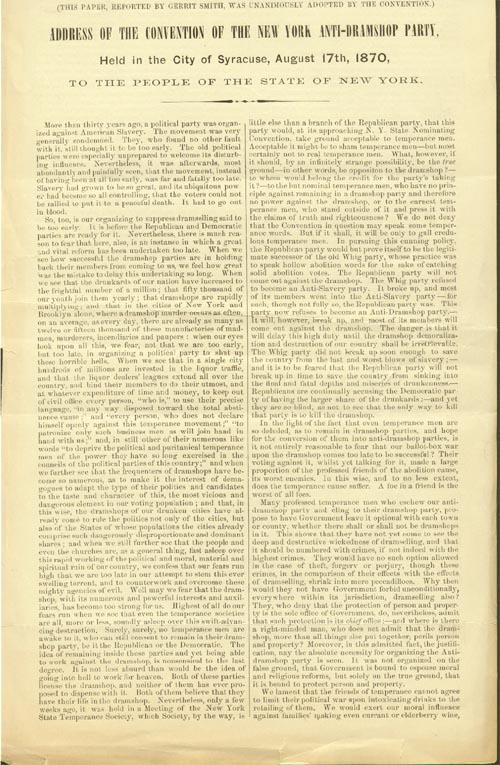 (TEMPERANCE). D. 2pp. 8 1/2" x 13 3/4". Syracuse. August 17th, 1870. A large printed document concerning the temperance movement: "More than thirty years ago, a political party was organized against American Slavery. The movement was very generally condemned...Slavery had grown to be so great...that the voters could not be rallied to put it to a peaceful death. It had to go out in blood. So, too, is our organizing to suppress dramselling said to be too early. It is before the Republican and Democratic parties are ready for it...we see that the drunkards of our nation have increased to the frightful number of a million...even the temperance societies are all, more or less, soundly asleep over this swift-advancing destruction...Many professed temperance men who eschew our anti-dramshop party and cling to their dramshop party, propose to have Government leave it optional with each town or county, whether there shall or shall not be dramshops in it...We lament that the friends of temperance cannot agree to limit their political war upon intoxicating drinks to the retailing of them...We admit that boundless evils have come from the manufacture and importation of alcohol...Dark as are our skies, the little light that is in them, is sufficient to sustain our hopes...". The document has one two inch tear through part of the text but it does not affect the legibility. An interesting document from the radical arm of the temperance movement.