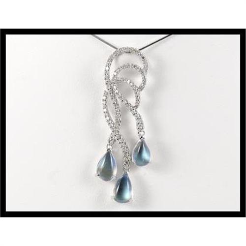 An 18K white gold elegant pendant contains with 3 pear shape moon stones that have an estimated total weight of 3.64 carats. Also set on this pendant are 85 single cut diamonds weighing approximately 0.53 carats total weight. This beautiful pendant measures 1.76 inches in length and 0.48 inches in width. It weights 7.20 grams.