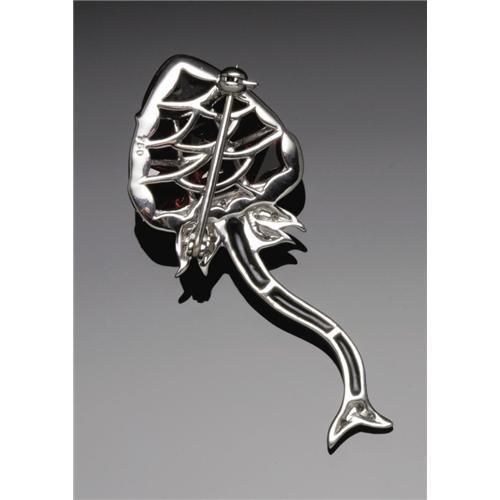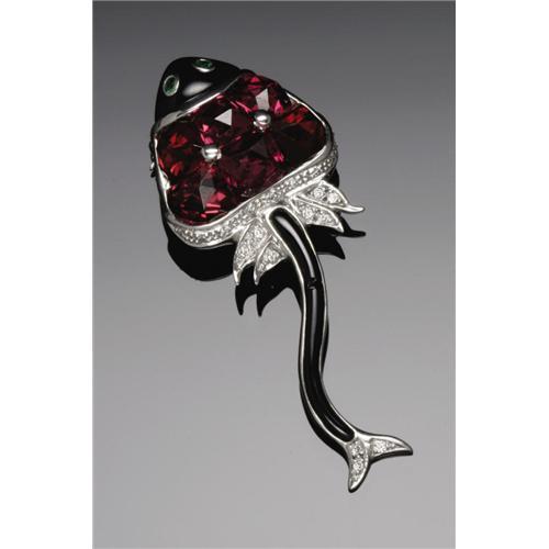 <B>An 18K White Gold Multi-Gemstone Brooch</B></I><BR><BR>The 18K white gold Tadpole brooch weighing 7.9 grams set with a melee of nineteen round full cut diamonds, total weight .1 Carats (estimated); Clarity: SI-1 - I-1; Color: H-I; a melee of six square faceted sapphires, total weight 9 Carats; Clarity: Moderately included (M2); Color: A 34.18.09 light Purple/Red; a melee of two round faceted emeralds, total weight .04 Carats (estimated); black onyx inlay to the head and tail. <I>Accompanied by a G.I.A. Graduate Gemologist appraisal.</B></I><BR>2in. long1 Items <BR><BR><B>Condition Report:</B> Normal signs of wear as appropriate with age; onyx is slightly chipped on the tail.