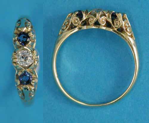 An 18ct gold 3-stone ring, claw-set with a central diamond flanked by sapphires £200-250