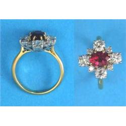An 18ct gold cluster ring, claw-set with an oval synthetic ruby bordered by 8 brilliant cut diamo...