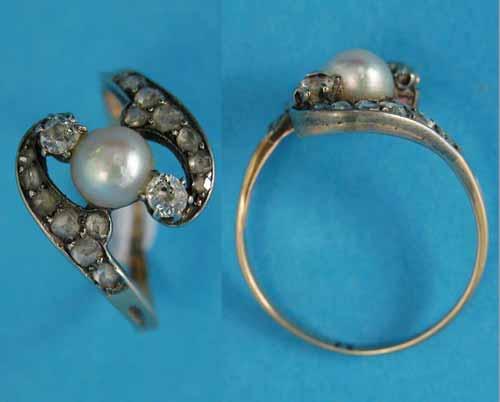 An 18ct gold cross-over ring, set with a cultured pearl flanked by 2 diamonds, the shoulders set rose-cut diamonds £200-300