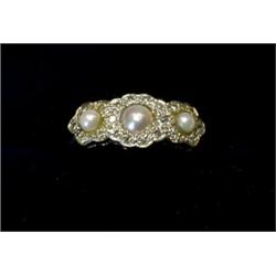 An 18ct gold ring set with three half pearls within a surround of small brilliant cut diamonds £90.