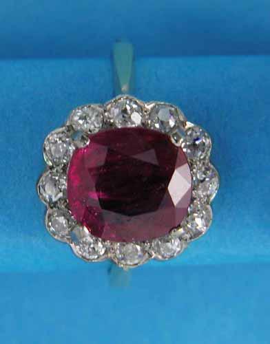 An 18ct gold ruby and diamond cluster ring, the cushion shaped ruby in a border of 12 diamonds £1,800-2,200