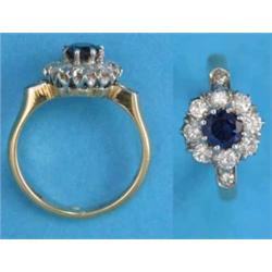 An 18ct gold, sapphire and diamond circular cluster ring, with diamond set shoulders...