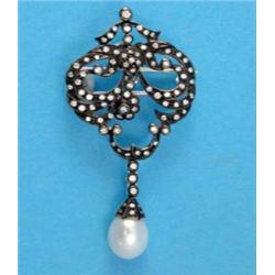 An 18ct white gold pendant/brooch of scroll design set diamonds with articulated cultured pearl drop below £150-200