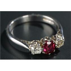 An 18ct white gold, ruby and diamond three stone ring, centred with an oval mixed-cut ruby approx. 0.53cts between old-cut diamonds approx. 0.41cts total, claw set to a square section shank, Birmingham 2001