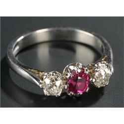 An 18ct white gold, ruby and diamond three stone ring, centred with an oval mixed-cut ruby approx. 0.66cts between old-cut diamonds approx. 0.47cts total, claw set to a square section shank, Birmingham 2001