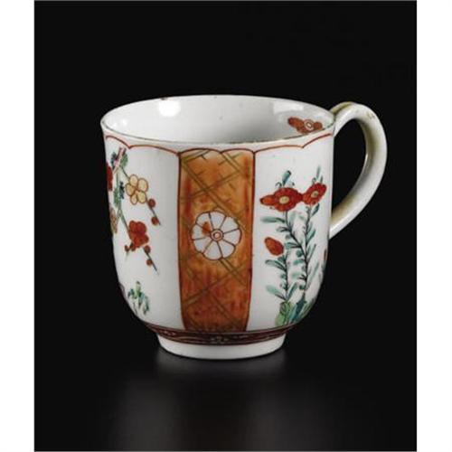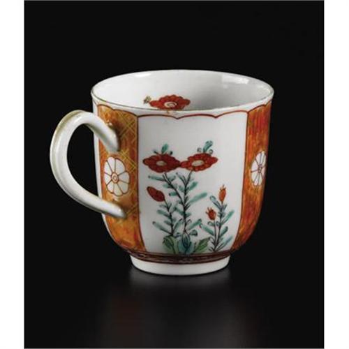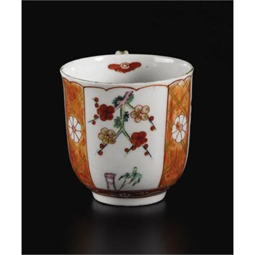 <B>An Eighteenth-century Chinese Export Porcelain Coffee Cup</B></I><BR><BR>Unknown maker<BR>Cheng-te-chen, China<BR>Possibly decorated in England<BR>circa 1765-1770<BR>hard paste porcelain with polychrome enamel decoration<BR>unmarked<BR>2.37 inches high x 3.37 inches wide x 2.37 inches deep<BR><BR>Painted with alternating panels of oriental flowering plants and narrower orange panels with gilt trellis work and a mons.<BR><BR><b>Shipping:</b> Requires 3rd Party Shipping (<a target="_blank" href="http://www.heritageauctions.com/common/shipping.php">view shipping information</a>)