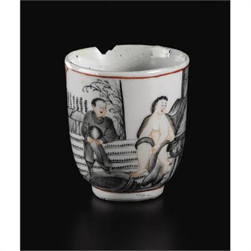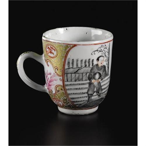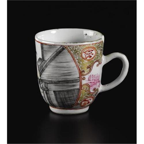 <B>An Eighteenth-century Chinese Export Porcelain Coffee Cup</B></I><BR><BR>Unknown maker<BR>Cheng-te-chen, China<BR>circa 1760-1800<BR>hard paste porcelain with polychrome enamel and gilt decoration<BR>unmarked<BR>2.5 inches high x 3 inches long x 2.25 inches deep<BR><BR>With grisaille and flesh tone decoration of a bathing Chinese woman with male onlooker, the reserve outlined in iron red; the handle framed by a shaped cartouche with puce landscape decoration and gilt floral ground containing oval floral reserves.<BR><BR><b>Shipping:</b> Requires 3rd Party Shipping (<a target="_blank" href="http://www.heritageauctions.com/common/shipping.php">view shipping information</a>)