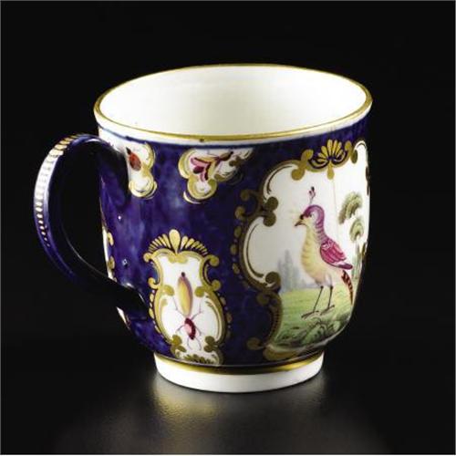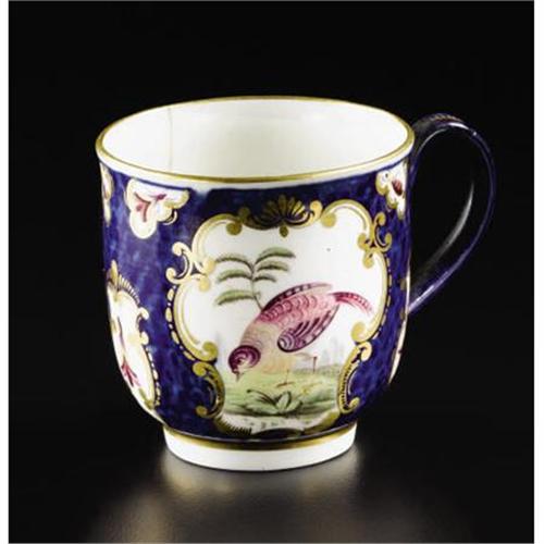 <B>An Eighteenth-century English Porcelain Coffee Cup</B></I><BR><BR>Worcester Porcelain Company<BR>Worcester, England<BR>circa 1768<BR>soft paste porcelain with polychrome enamel and gilt decoration<BR>Marks: fretted square<BR>2.38 inches high x 3.18 inches wide x 2.63 inches deep<BR><BR>Painted with exotic birds within cartouche shaped panels edged in gilt, divided by insects within shaped panels edged in gilt, all upon a blue scale ground with gilt border and lip.<BR><BR><b>Shipping:</b> Requires 3rd Party Shipping (<a target="_blank" href="http://www.heritageauctions.com/common/shipping.php">view shipping information</a>)