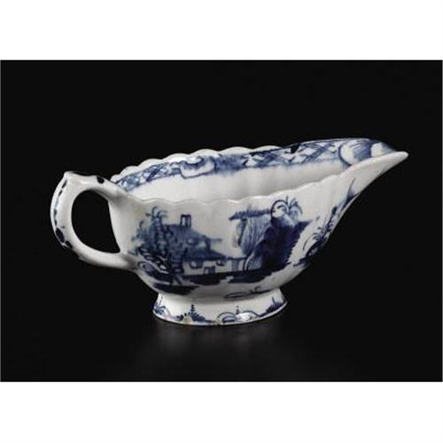 <B>An Eighteenth-century English Porcelain Sauceboat</B></I><BR><BR>Worcester Porcelain Company<BR>Worcester, England<BR>circa 1750-1760<BR>soft paste porcelain with underglaze blue decoration<BR>unmarked<BR>2.25 inches high x 5.25 inches wide x 2.25 inches wide<BR><BR>With scalloped rim, decorated in underglaze blue with addorsed chinoiserie garden scenes; the interior with fret pattern to rim and chinoiserie motif to bottom.<BR><BR><b>Shipping:</b> Requires 3rd Party Shipping (<a target="_blank" href="http://www.heritageauctions.com/common/shipping.php">view shipping information</a>)