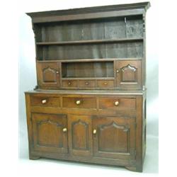 An 18th Century oak dresser, with moulded cornice and three shelves over three spice drawers flanked by cupboards, the base with three long drawers over two arch panelled doors, on stile feet 5ft., height 6ft. 4in. £4,000-6,000