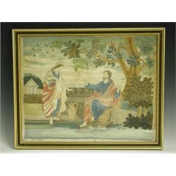 An 18th Century silkwork and woolwork picture of a biblical scene, inscribed to the border 'An...