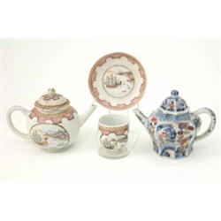 An 18th century Chinese export bullet teapot, painted with panels of ships in harbour, within a field of scrollwork bianco sopra bianco (cover damaged) 6ins with matching teacup and saucer. An octagonal clobbered teapot and cover £100-150