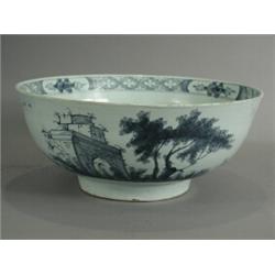 An 18th century Delft blue and white bowl painted with two figures in an Italianate landscape, (c...