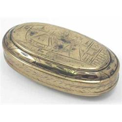 An 18th century Dutch oval brass tobacco box, engraved with figures in domestic settings and the base pierced with ownership initials, 5 ins. £150-200