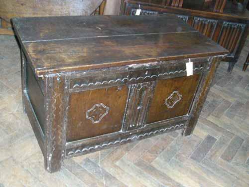 An 18th century carved oak coffer with later plank top, H 61cms W 104cms £200-300