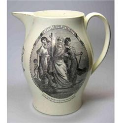 An 18th century creamware jug, possibly Liverpool, the bellied shape printed with an oval scene of communion titled 'Religion' opposite another oval scene 'Faith Hope and Charity', four bunches of grapes below the spout, 20cm high (W) £200-300