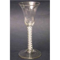 An 18th century double-series opaque twist wine glass, with bell bowl and cylindrical stem, on conical foot, circa 1760, 6.75in. £180-220
