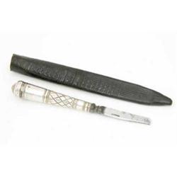 An 18th century knife, with silver mounted handle and steel blade, broken, in an embossed leather...