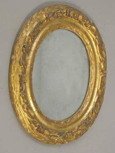 An 18th century oval wall mirror, with a foliate carved giltwood frame, the plate 11ins x 9ins £200-300
