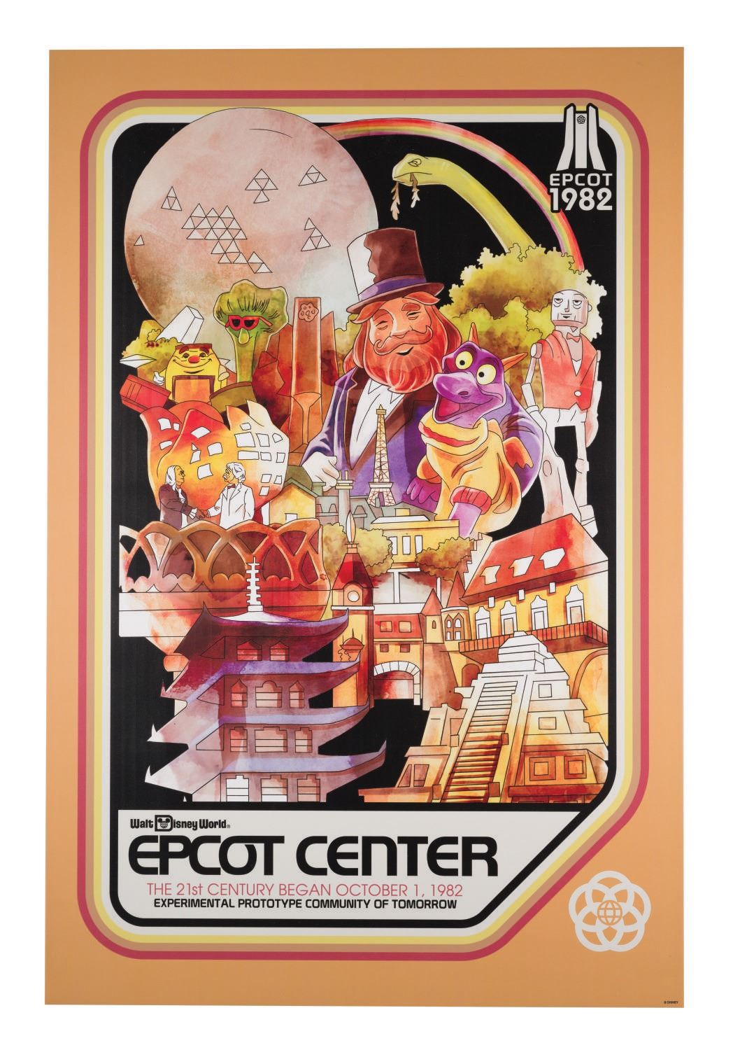 (D23, 2017) A large "Epcot Center 1982" Through the Years poster print. Produced for the 35th anniversary of Epcot Center, the limited-edition poster was released through the 2017 D23 Expo and depicts Figment and the Dreamfinder introducing Future World and the Epcot World Showcase. Measuring 36"x54.25", the high-quality poster is in fine condition.