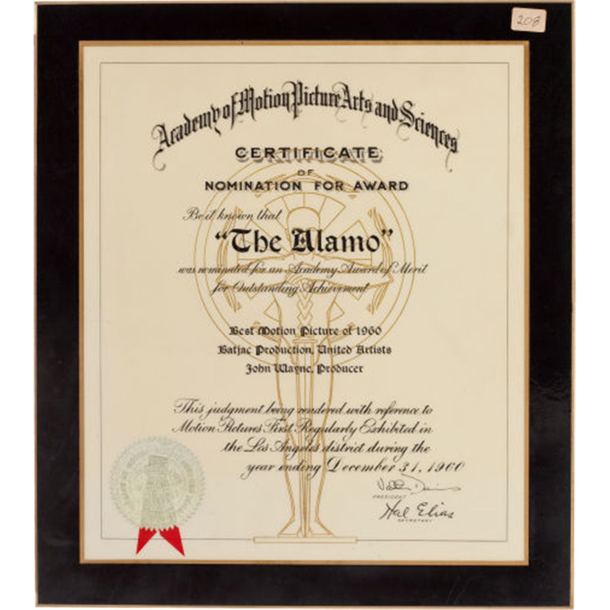 An Academy of Motion Picture Arts and Sciences Certificate of Nomination for "The Alamo." United Artists, 1960. Presented to John Wayne as producer of the film; text reads in part "Be it known that / "The Alamo" / was nominated for an Academy Award of Merit / for Outstanding Achievement / Best Motion Picture of 1960 / Batjac Production, United Artists / John Wayne, Producer;" an official 'PermaPlaque' mounted to wood and shellacked; with a JW inventory sticker; included is a reprinted color image showing this piece in situ in Wayne's Newport Beach office.14" x 12"