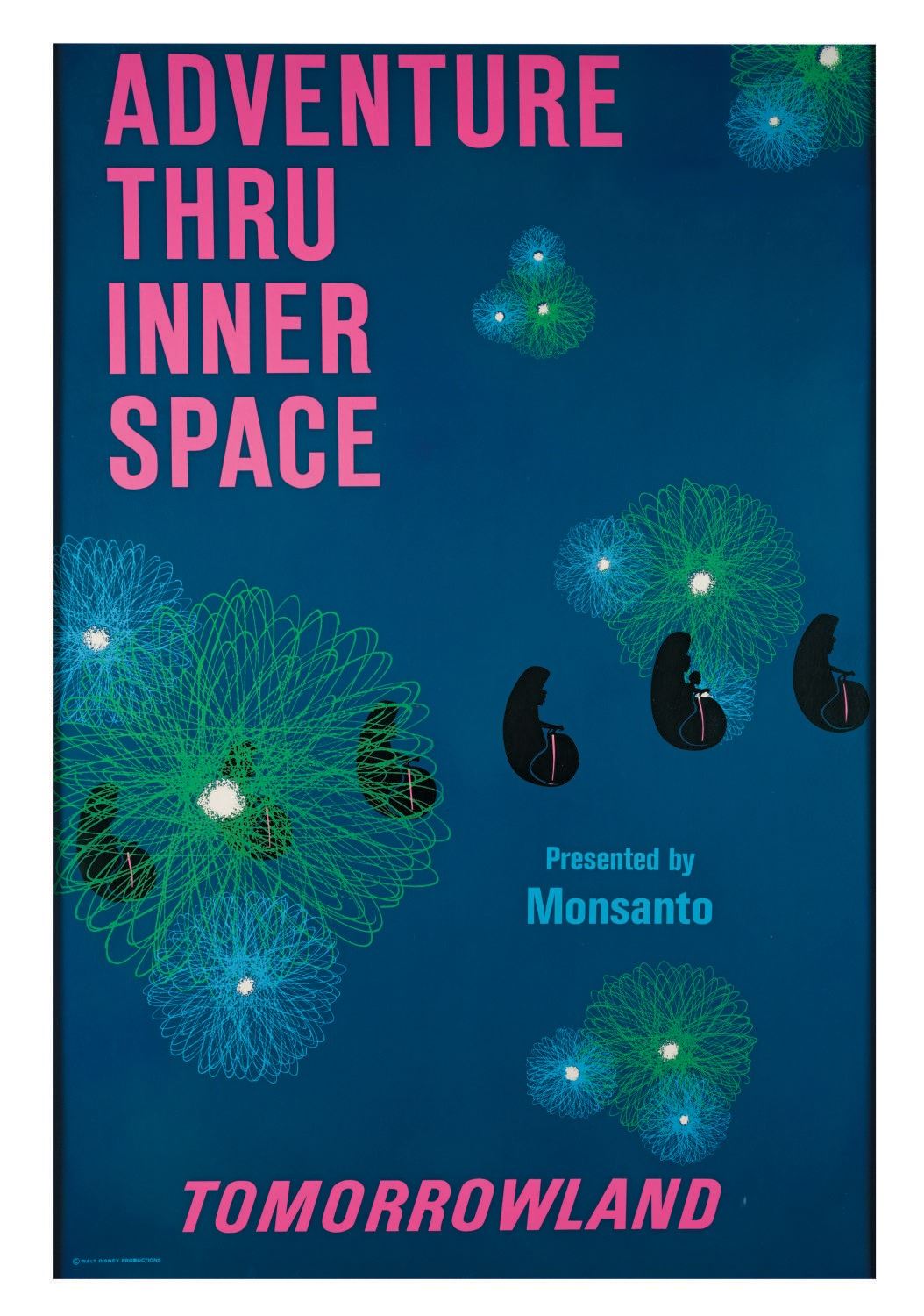(Disneyland, 1967) An original hand silk-screened poster for Monsanto's Adventure Thru Inner Space. The visually stunning poster was designed by John Drury and depicts the iconic Atomobiles and passengers reaching magnification, on their journey beyond the Mighty Microscope and into unknown realms. This earliest variant of the poster includes "Presented by Monsanto", who sponsored the attraction until 1977. Measuring 36"x54", the poster is in very good condition, with scuffs, creases, and wear along the edges and throughout.