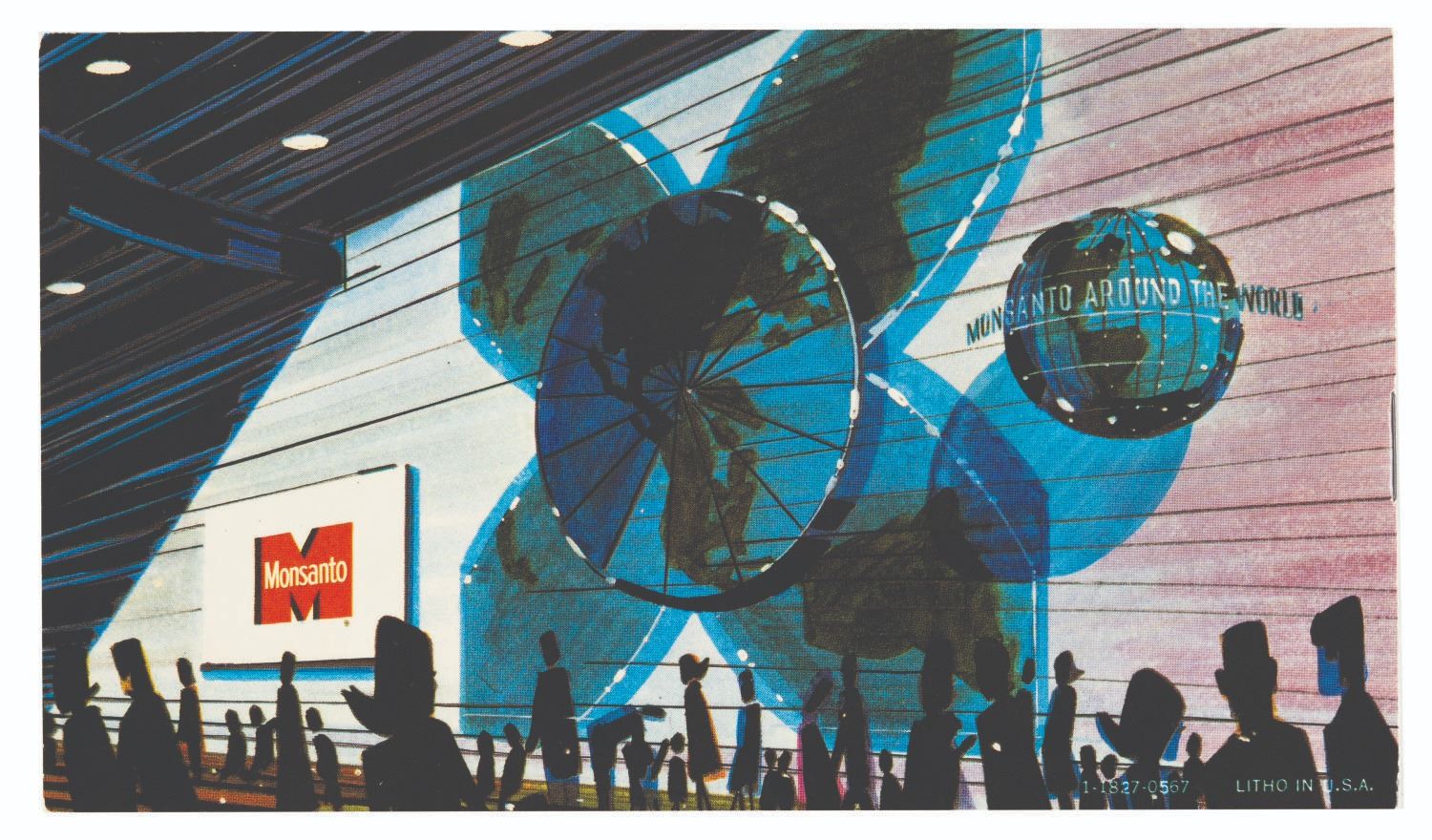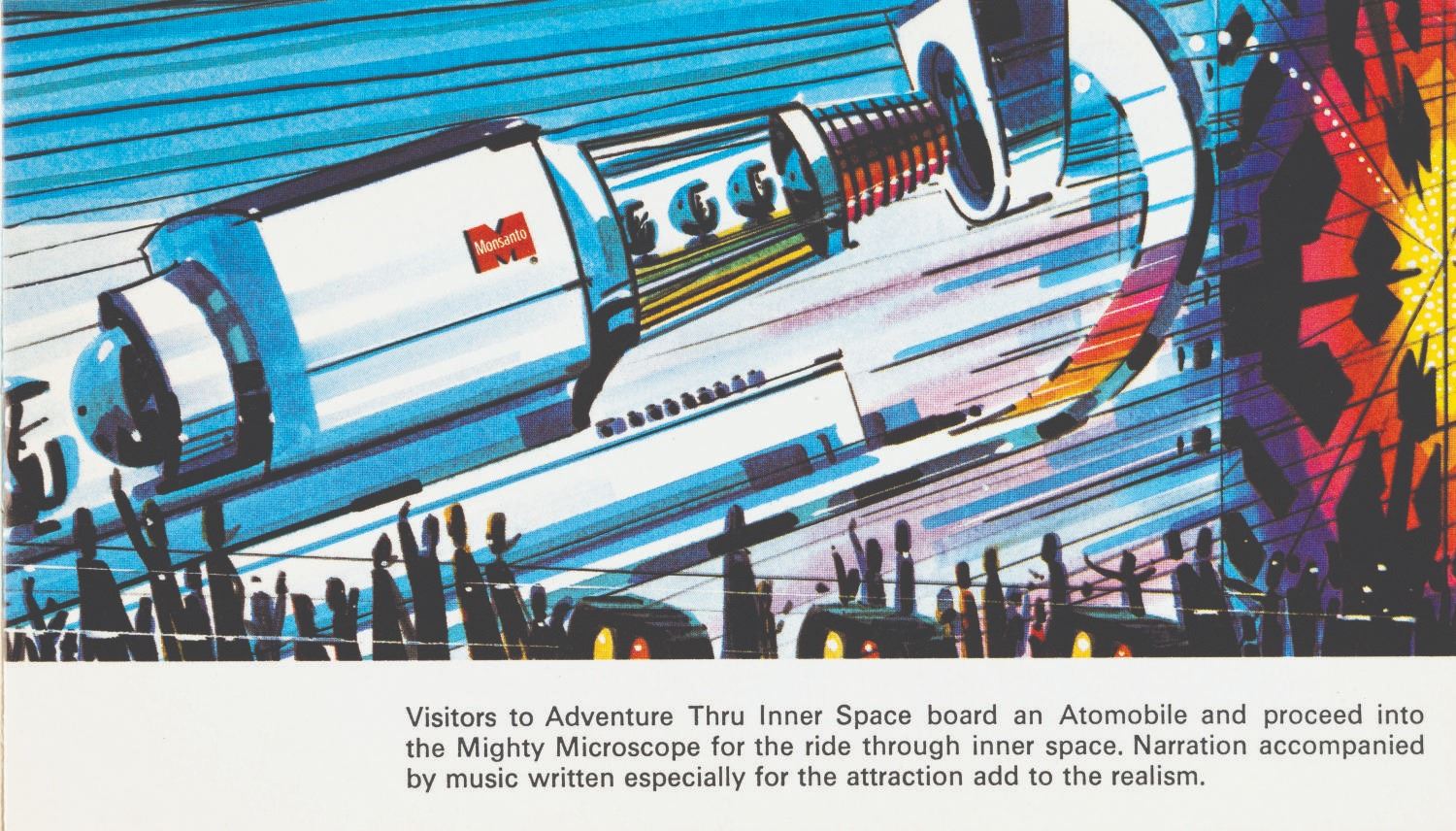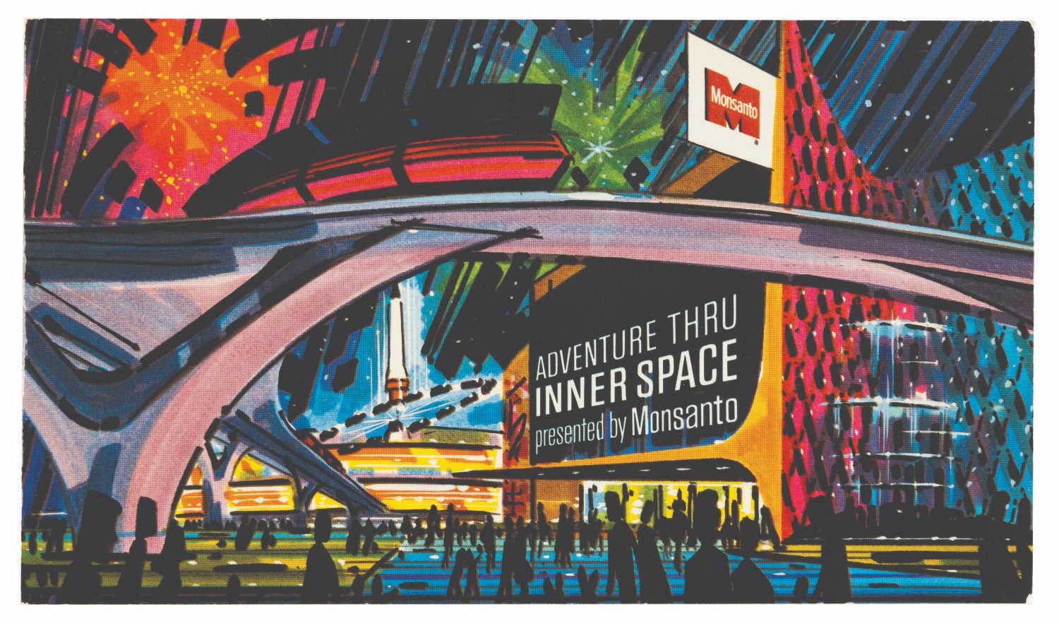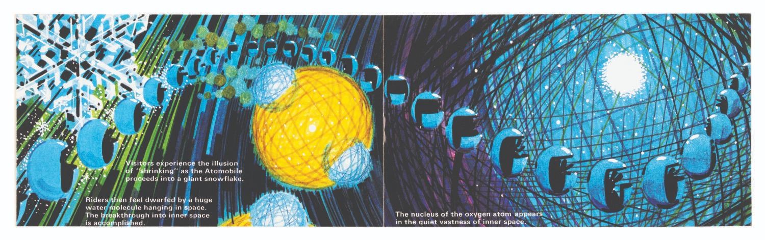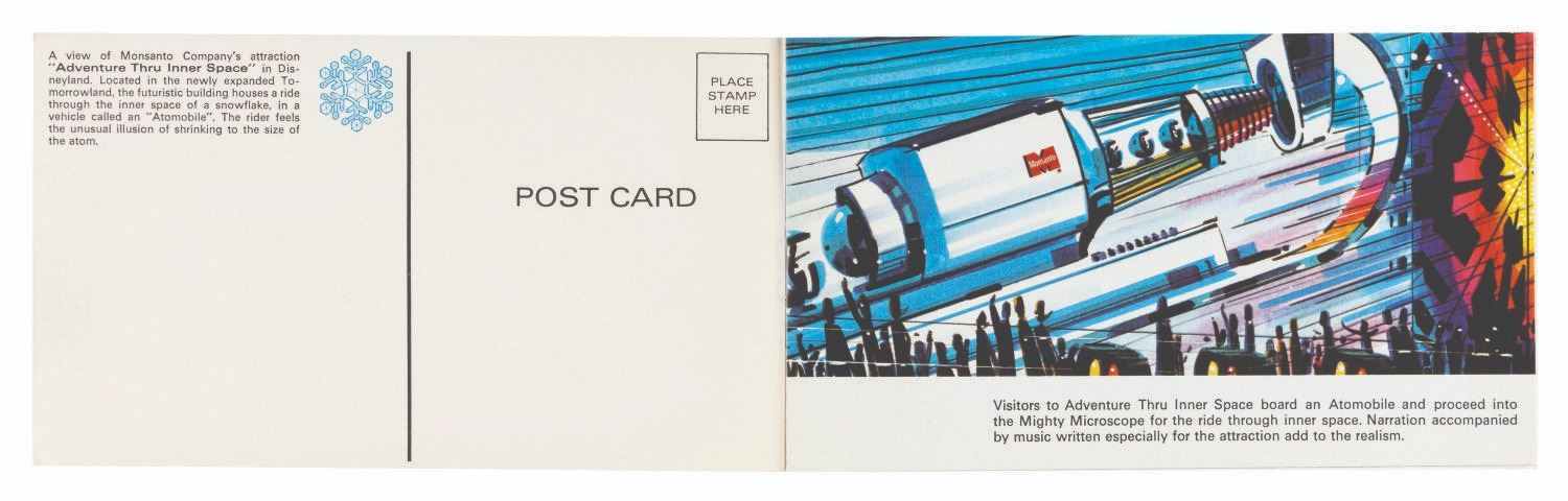 (Disneyland, 1967) A beautifully illustrated ten-page booklet featuring the art of the Adventure Thru Inner Space attraction and information about its sponsor, Monsanto. The front and back covers are removable postcards of the attraction entrance and the World Clock. Measuring 3.5" x 6", the booklet is in very good condition with minor scratches and light edge wear.